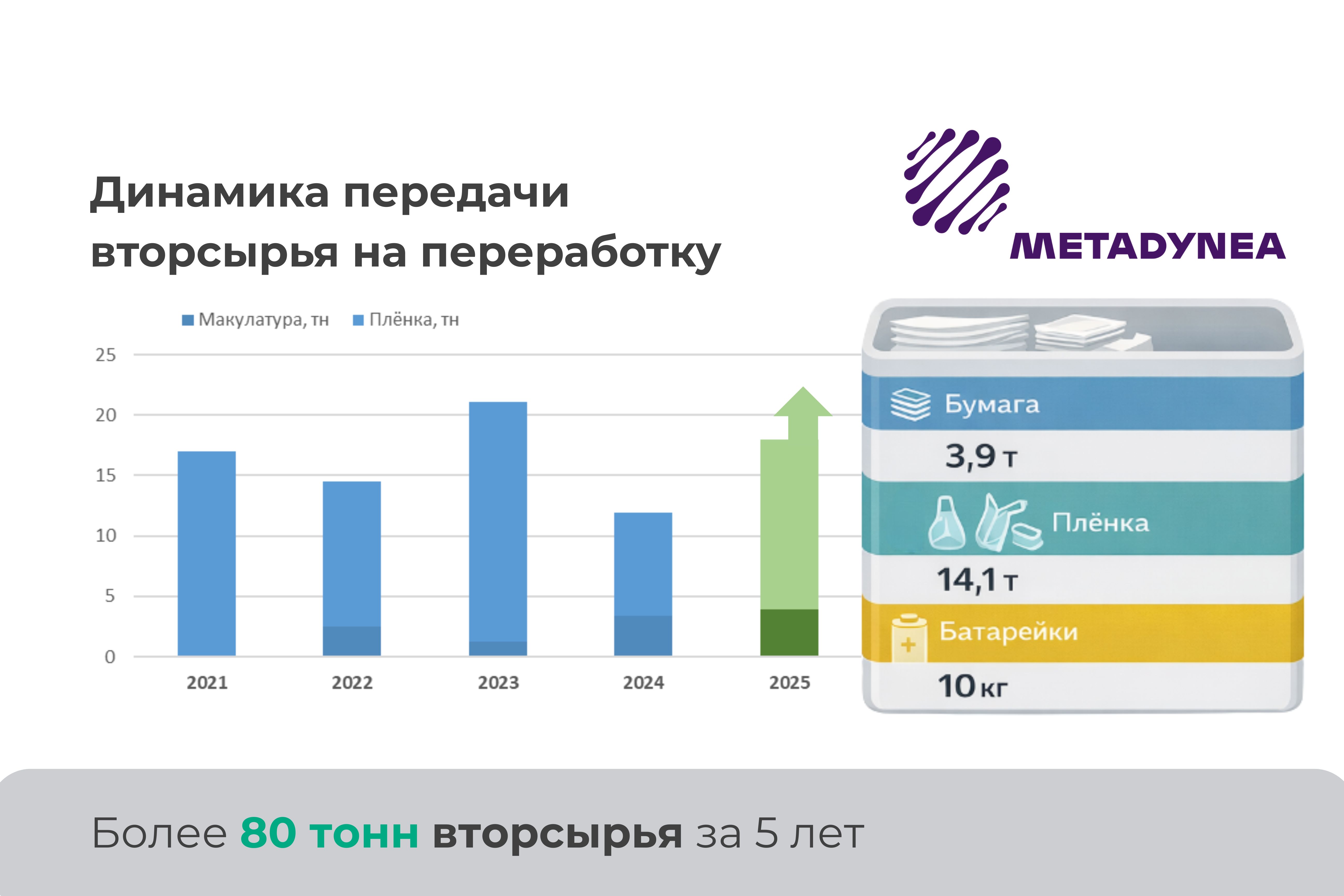 «Метадинеа» последовательно выстраивает систему раздельного сбора и фиксирует результаты в годовой динамике. За последние пять лет предприятие передало на переработку более 80 тонн вторсырья. С отчётом о сборе вторсырья за 2024 год можно ознакомиться по ссылке.